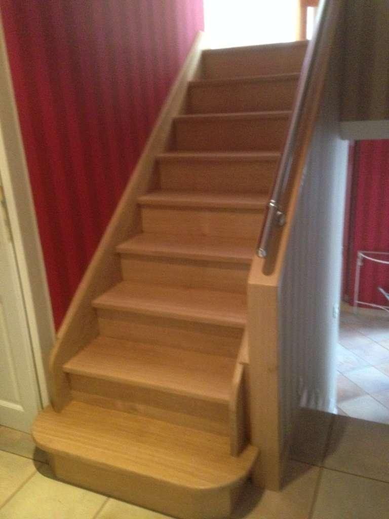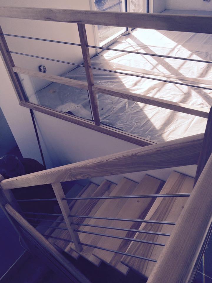 Fabrication puis pose de cet escalier en frêne olivier; gade-corps bois, inox et macrolon